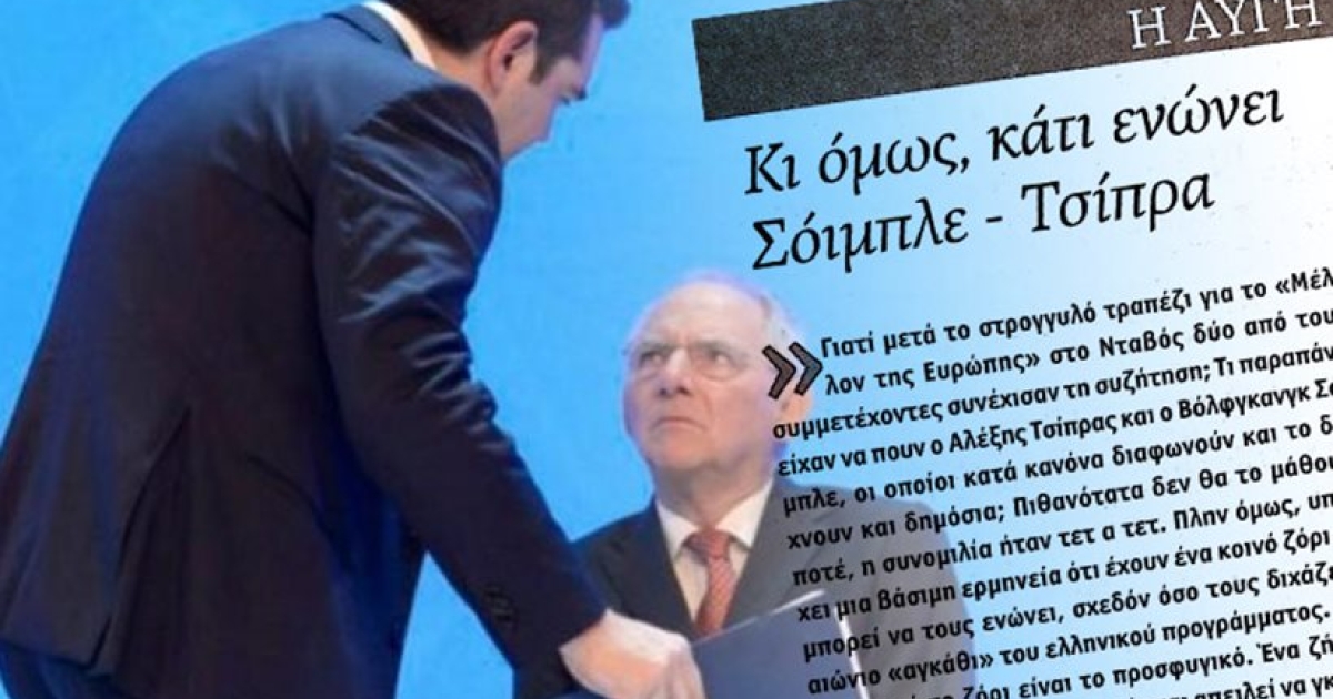 Επίσης η εφημερίδα αναφέρθηκε στο ίδιο θέμα και στο κεντρικό της άρθρο με τίτλο «Κι όμως, κάτι ενώνει Σόιμπλε - Τσίπρα»: