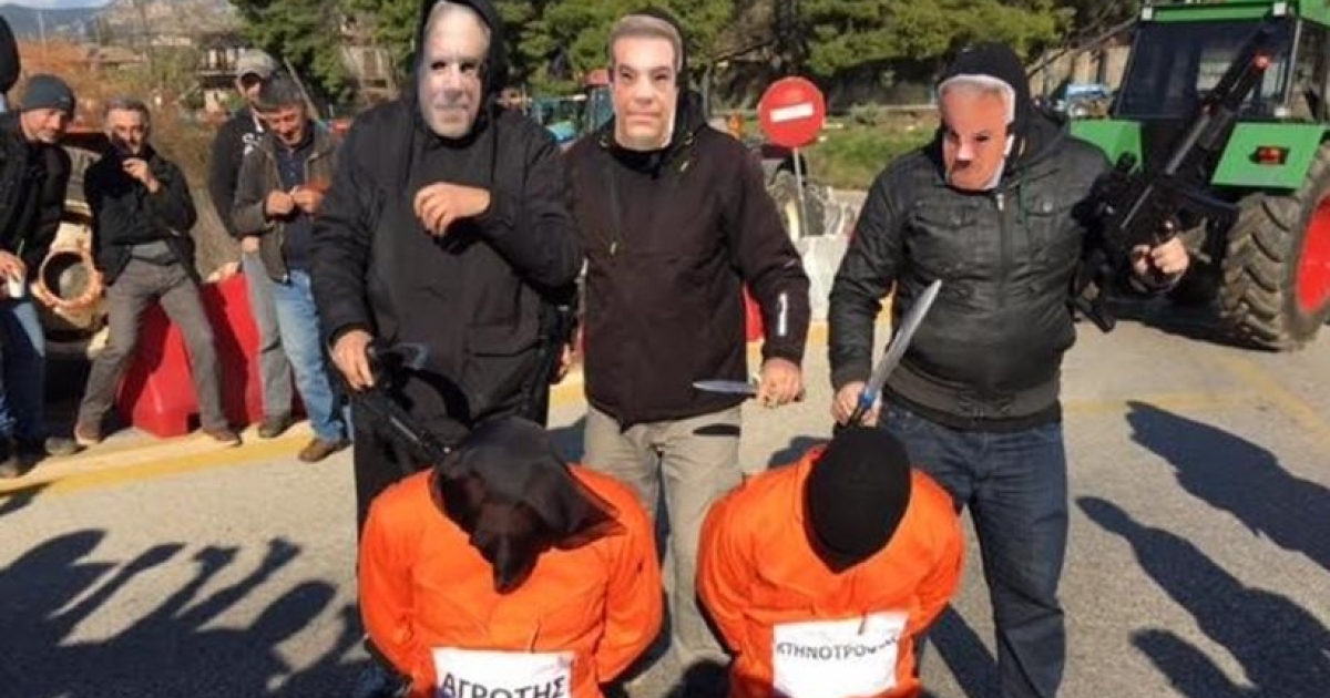 Η οργή των αγροτών για το νέο νομοσχέδιο για το ασφαλιστικό φαίνεται ότι έχει ξεχειλίσει γι' αυτό και αποφάσισαν να παραλληλίσουν την κατάσταση που βιώνουν με τα δεινά που έρχονται αντιμέτωποι οι αιχμάλωτοι των τζιχαντιστών του Ισλαμικού Κράτους.