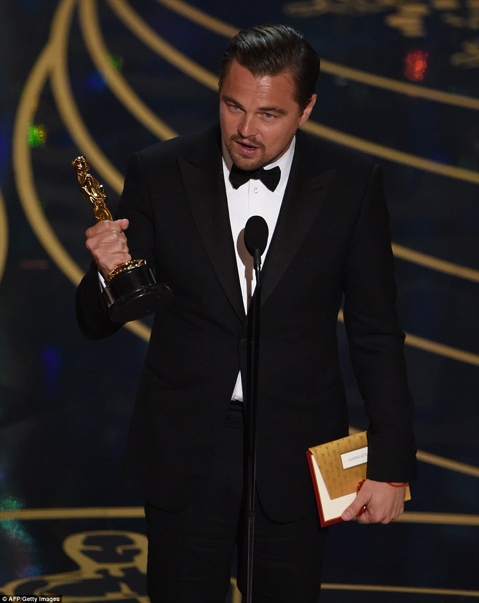 O Λεονάρντο Ντι Κάπριο έχοντας παραλάβει για πρώτη φορά το βραβείο στην καριέρα του