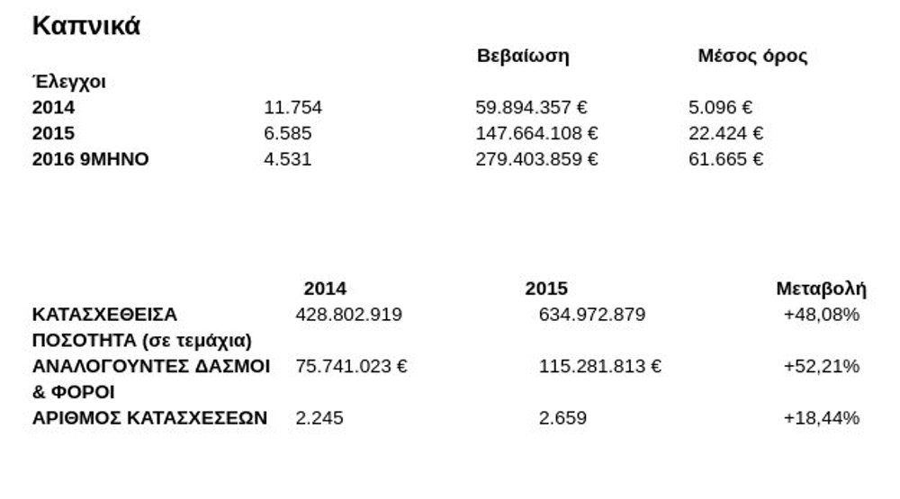 Η αισιόδοξη ανάγνωση αυτών των στοιχείων είναι ότι οι έλεγχοι έγιναν πιο αποτελεσματικοί. Η ρεαλιστική προσέγγιση είναι ότι το λαθρεμπόριο καπνικών έχει λάβει εκρηκτικές διαστάσεις κι αυτό προκύπτει κι από τα στοιχεία των κατασχεθέντων: μέσα σε έναν χρόνο αυξήθηκαν κατά 48%, ενώ μόνο στη διάρκεια των πρώτων εννιά μηνών του 2016 κατασχέθηκαν 363.933.423 λαθραία τσιγάρα και περίπου 16 τόνοι λαθραίου καπνού!