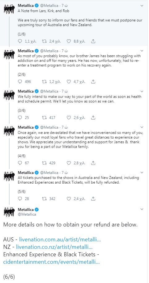 Τα υπόλοιπα μέλη του συγκροτήματος, οι Lars Ulrich, Kirk Hammett και Robert Trujillo με ένα μήνυμά τους, ανακοίνωσαν πως ο 56χρονος μπαίνει σε κέντρο αποτοξίνωσης, με αποτέλεσμα να μην μπορεί να γίνει το tour.