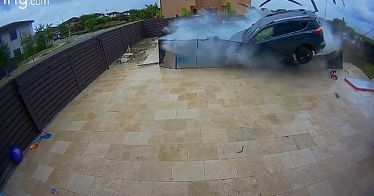 Τύχη βουνό είχε μια οικογένεια στο Μαϊάμι της Φλόριντα όταν ένα SUV έσπασε τον φράκτη του σπιτιού, πέρασε πάνω από την πισίνα και τελικά προσγειώθηκε στον δρόμο.