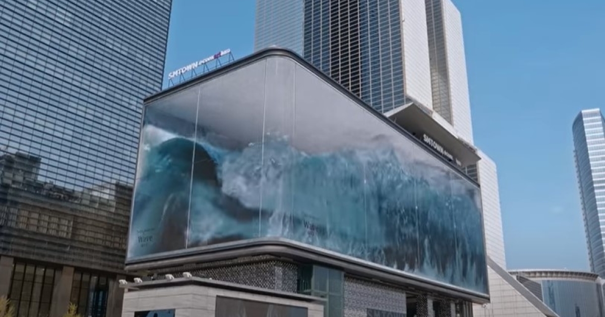 Εάν κάποιος δεν γνωρίζει πως είναι πινακίδα νομίζει πως πρόκειται για πραγματικό κύμα που πέφτει σε ένα μεγάλο κουτί, πάνω από το εμπορικό κτίριο στη διάσημη συνοικία Gangnam της Σεούλ.