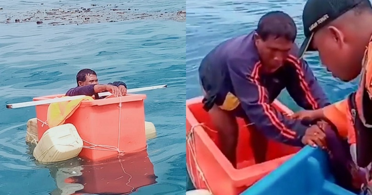 Ενώ, όμως, ήταν πια σίγουρος πως θα πεθάνει, το λιμενικό τον εντόπισε να πλέει μέσα σε ένα μικρό πλαστικό ψυγείο για ψάρια που είχε μαζί του, το οποίο και χρησιμοποίησε ως σχεδία!