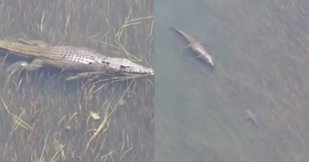 Απίστευτο εναέριο βίντεο κατέγραψε τη στιγμή που ένας τεράστιος κροκόδειλος αλμυρού νερού και ένας καρχαρίας έρχονται πρόσωπο με πρόσωπο στο νερό στα ανοικτά των ακτών της Αυστραλίας, ενώ λίγα μόλις μέτρα μακριά κολυμπούν παιδιά, όπως αναφέρει η Daily Mail.