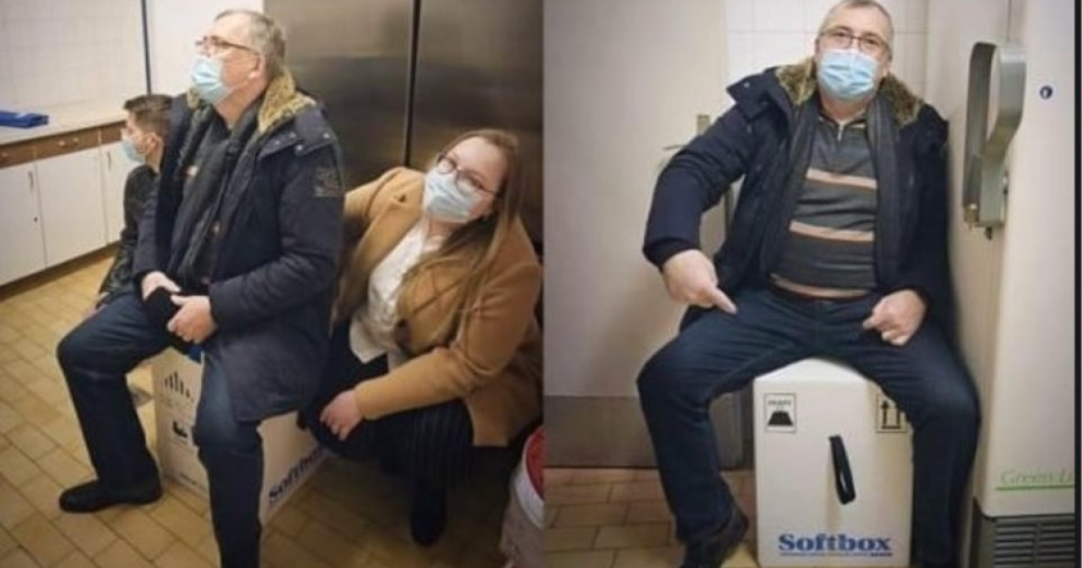 Λίγη ώρα αργότερα όμως, φωτογραφήθηκε καθισμένος πάνω σε μία κούτα από εμβόλια λες και ήταν καφάσι από μπύρες.