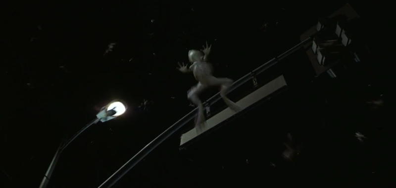 Εν τω μεταξύ, αυτήν τη σκηνή την προετοιμάζει - χωρίς να το αντιληφθούμε - σε όλη την ταινία. Υπάρχει ένα απόσπασμα στην Έξοδο της Παλαιάς Διαθήκης της Βίβλου, το 8:2, στο οποίο ο θεός λέει στον Μωυσή να πει στον Φαραώ ότι «αν αρνηθεί να αφήσει τους ανθρώπους να περάσουν, θα στείλει μια πληγή βατράχων σε ολόκληρη τη χώρα. Ο Νείλος θα γεμίσει με βατράχους. Θα έρθουν στο παλάτι σας και στην κρεβατοκάμαρά σας και στο κρεβάτι σας, στα σπίτια των αξιωματούχων σας και στον λαό σας, στους φούρνους σας και στις ζυμώσεις». Χωρίς η ταινία να έχει θρησκευτικές ανησυχίες, αυτό ήταν το setup για να έρθει εν τέλει ο από μηχανής θεός. Μπορεί να μην το παρατηρήσατε, αλλά οι αριθμοί 8 & 2 υπάρχουν στην ταινία δίπλα, δίπλα σε περισσότερα από 100 πλανά!