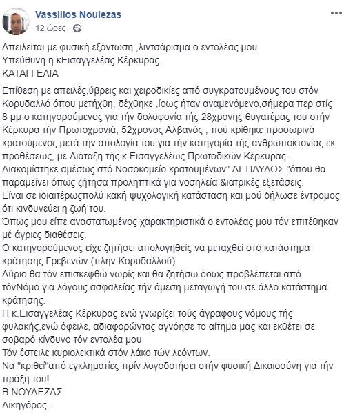 Σύμφωνα με την ανάρτηση του νομικού: «είναι σε πολύ κακή ψυχολογική κάσταση και δήλωσε έντρομος ότι κινδυνεύει η ζωή του. Όπως είπε χαρακτηριστικά του επιτέθηκαν με άγριες διαθέσεις. Ο κατηγορούμενος είχε ζητήσει να μεταχθεί στο κατάστημα κράτησης Γρεβενών».
