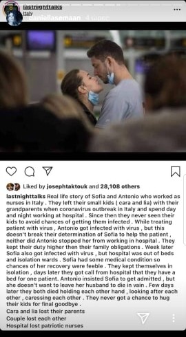Αφού, λοιπόν, με μια πρώτη ανάγνωση ήρθε μια θλίψη για το πόσο άδικα χάθηκαν δύο νέοι άνθρωποι, που είχαν όλο το μέλλον μπροστά τους και δύο παιδιά έμειναν ορφανά, γεννήθηκαν πολλά ερωτήματα. Και αυτό οδήγησε σε περισσότερο ψάξιμο. Πατώντας στο Google τα... πάντα από λέξεις - κλειδιά (couple kissing masks nurses κ.ο.κ.) αρχίζουν και εμφανίζονται μπροστά στην οθόνη διάφορα άρθρα που δείχνουν πως το ζευγάρι ήταν Δόξα τω Θεώ - κι ελπίζουμε να είναι ακόμα - καλά στην υγεία του.