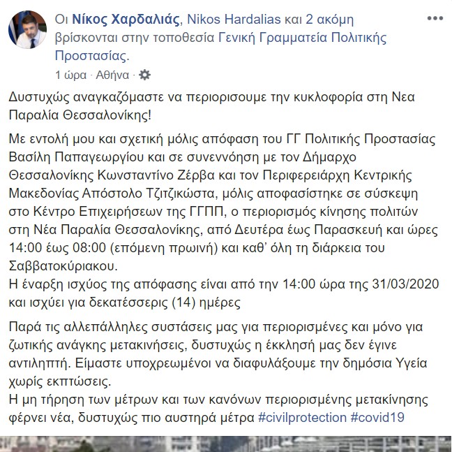 Με εντολή μου και σχετική μόλις απόφαση του ΓΓ Πολιτικής Προστασίας Βασίλη Παπαγεωργίου και σε συνεννόηση με τον Δήμαρχο Θεσσαλονίκης Κωνσταντίνο Ζέρβα και τον Περιφερειάρχη Κεντρικής Μακεδονίας Απόστολο Τζιτζικώστα, μόλις αποφασίστηκε σε σύσκεψη στο Κέντρο Επιχειρήσεων της ΓΓΠΠ, ο περιορισμός κίνησης πολιτών στη Νέα Παραλία Θεσσαλονίκης, από Δευτέρα έως Παρασκευή και ώρες 14:00 έως 08:00 (επόμενη πρωινή) και καθ’ όλη τη διάρκεια του Σαββατοκύριακου.