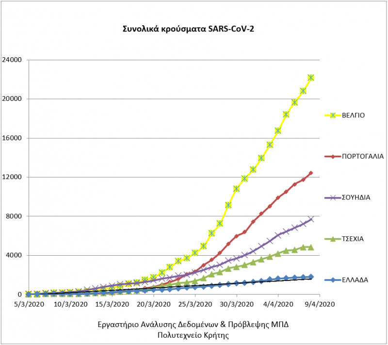Όπως προκύπτει από το διάγραμμα 1, για το Βέλγιο, Πορτογαλία και Σουηδία, η πορεία των κρουσμάτων είναι καθαρά εκθετική, ενώ για την Τσεχία έχει εικόνα πολυωνυμικής, ενώ η Ελλάδα διατηρεί την γραμμική πορεία αύξησης των κρουσμάτων.