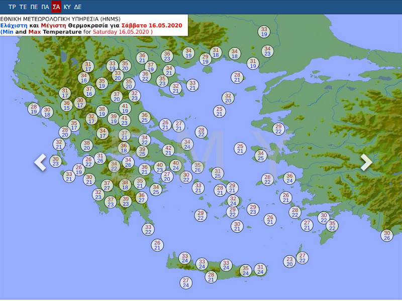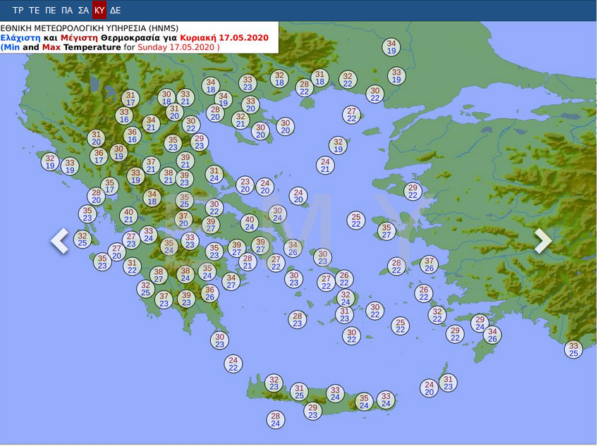 Σύμφωνα με τα διαθέσιμα προγνωστικά δεδομένα του Εθνικού Αστεροσκοπείου Αθηνών/meteo.gr, η μέγιστη θερμοκρασία αναμένεται να φτάσει κατά τόπους τους 32-34 βαθμούς Κελσίου στη Θεσσαλία, την Ανατολική Στερεά Ελλάδα και την Πελοπόννησο, ενώ σε περιοχές της Βόρειας Κρήτης ο υδράργυρος θα φτάσει τους 34 και τοπικά τους 36-38 βαθμούς Κελσίου. Η τελική διαμόρφωση της θερμοκρασίας θα εξαρτηθεί σε σημαντικό βαθμό από την παρουσία σκόνης και τους τοπικούς ανέμους.