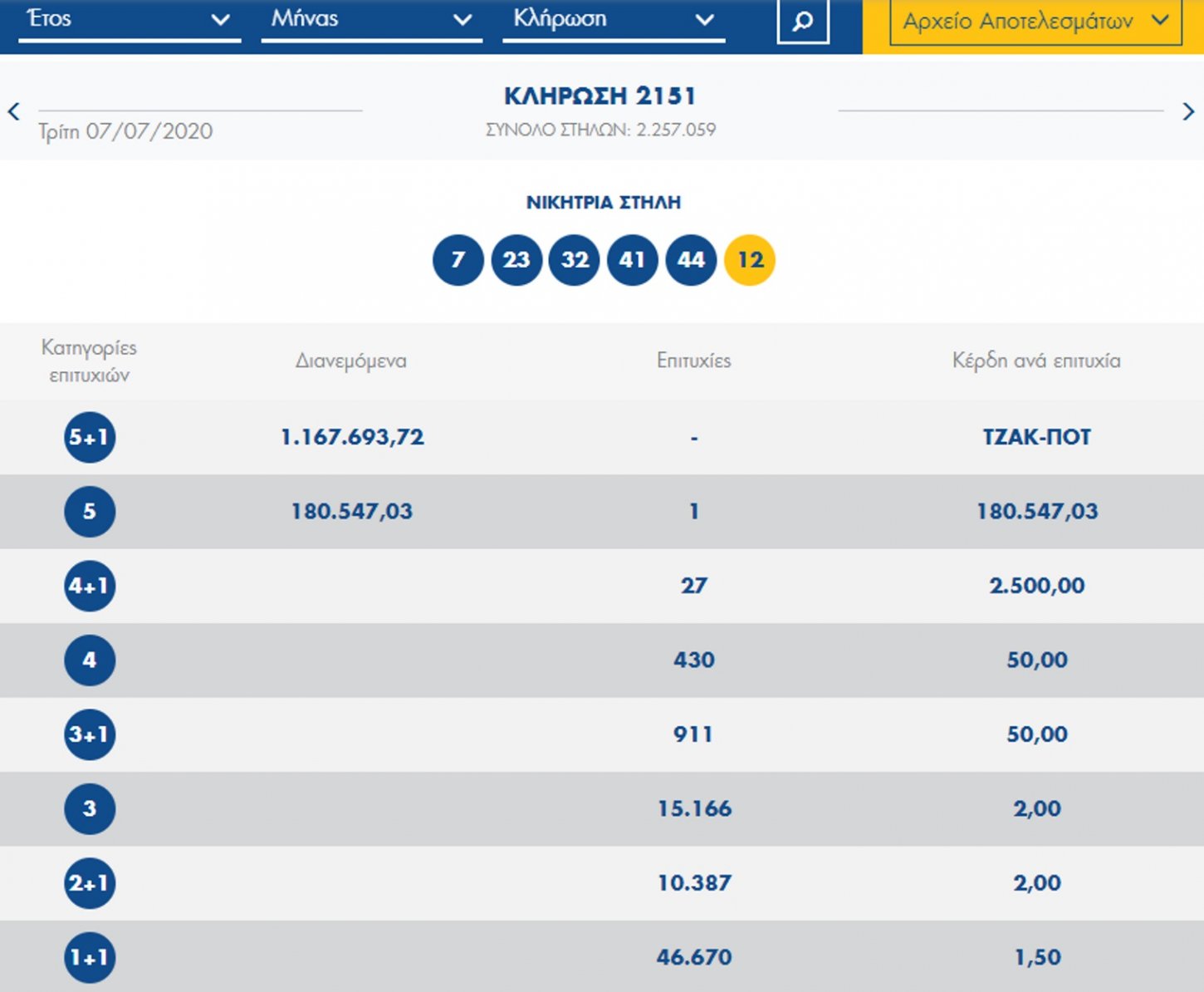 Πλέον, μετά το χθεσινό τζακ ποτ στην κατηγορία 5+1, στην κλήρωση της Κυριακή το ποσό φτάνει τουλάχιστον τα 1,4 εκατομμύρια ευρώ.