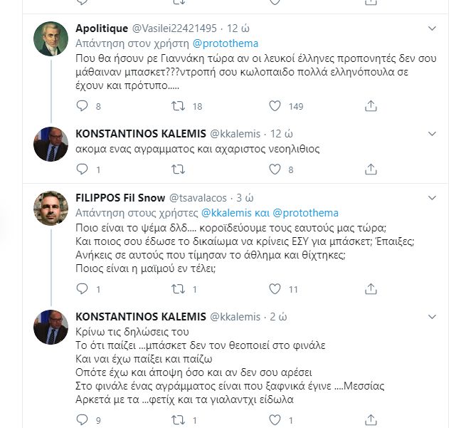 Δε σταμάτησε όμως εκεί. Απαντώντας σε επικριτικά σχόλια, επέμενε και στο ύφος και στους χαρακτηρισμούς. «Ακόμα ένας αχάριστος και αγράμματος νεοηλίθιος» γράφει σε άλλο σχόλιο.Ο τύπος που κάνει αυτή τη χυδαία ρατσιστική επίθεση στον Γιάννη Αντετοκούνμπο είναι ο Κωνσταντίνος Καλεμης, Συντονιστής εκπαίδευσης προσφύγων του υπουργείου Παιδείας. Να τον χαίρονται pic.twitter.com/SoLvCmMram