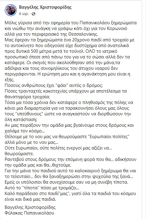 «Μόλις γύρισα από την εφημερία του Παπανικολάου ξημερώματα και νιώθω την ανάγκη να γράψω κάτι όχι για τον Κορωνοιό αλλά για τον περιφερειακό της Θεσσαλονίκης.
