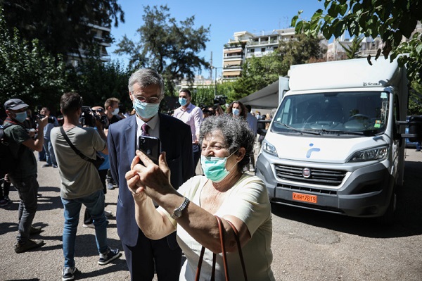 Η πιο χαρακτηριστική στιγμή, ωστόσο, ήταν όταν μια ηλικιωμένη γυναίκα πλησίασε τον Σωτήρη Τσιόδρα, έβγαλε το κινητό της τηλέφωνο και του ζήτησε να βγάλουν μαζί μία selfie φωτογραφία. Ο λοιμωξιολόγος δεν της χάλασε το χατίρι και φωτογραφήθηκε μαζί της.