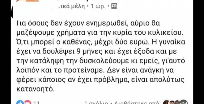 Αναλυτικά το μήνυμα αναφέρει: «Για όσους δεν έχουν ενημερωθεί, αύριο θα μαζέψουμε χρήματα για την κυρία του κυλικείου. Ότι μπορεί ο κάθένας. Μέχρι 2 ευρώ. Η γυναίκα έχει να δουλέψει 9 μήνες, έχει έξοδα και με την κατάληψη την δυσκολεύουμε κι εμείς, γιατί λοιπόν και το προτείναμε. Δεν είναι ανάγκη να φέρει κάποιος αν έχει πρόβλημα, είναι απολύτως κατανοητό».