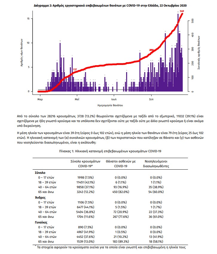 Τέλος, έχουμε 15 ακόμα καταγεγραμμένους θανάτους και 549 θανάτους συνολικά στη χώρα. 205 (37.3%) γυναίκες και οι υπόλοιποι άνδρες. Η διάμεση ηλικία των θανόντων συμπολιτών μας ήταν τα 79 έτη και το 96.2% είχε κάποιο υποκείμενο νόσημα ή/και ηλικία 70 ετών και άνω».