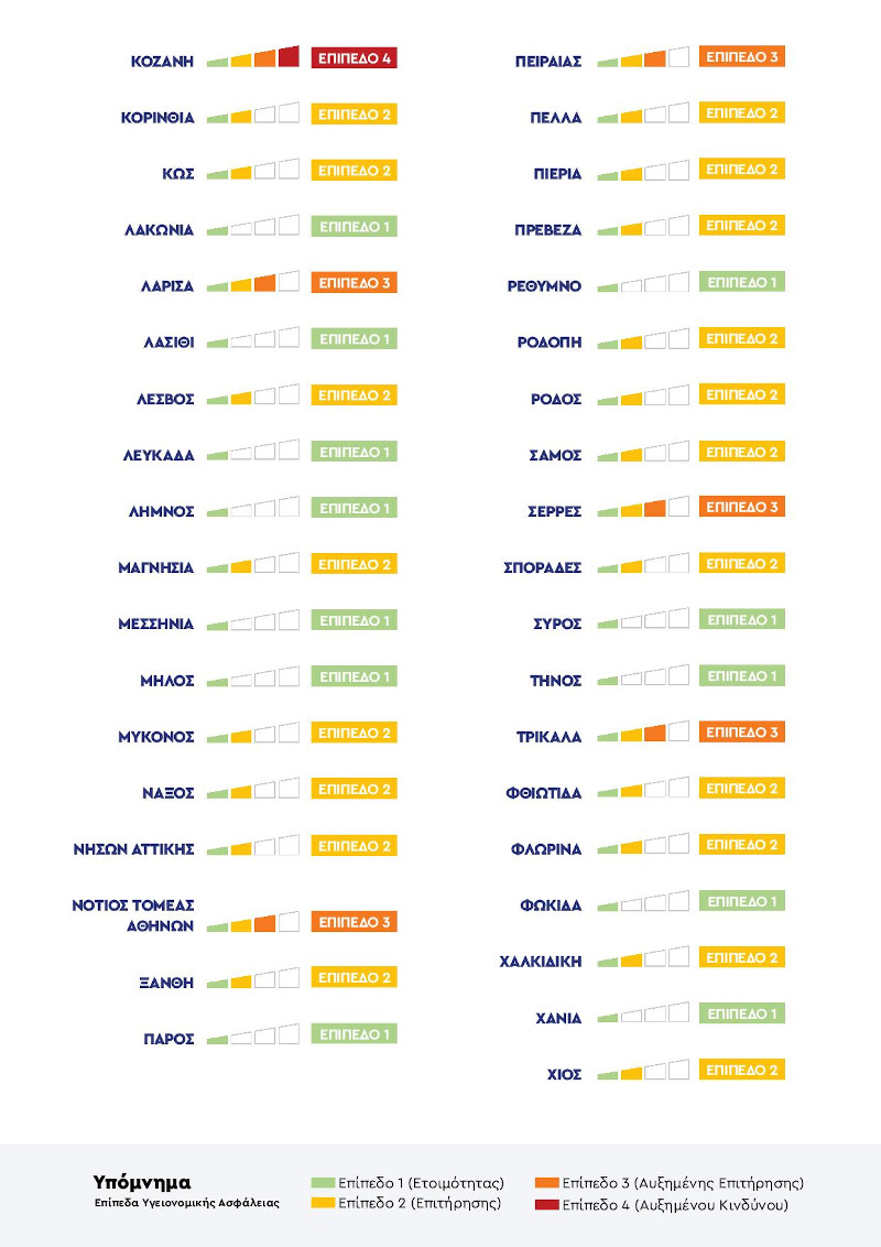 Παράλληλα, υπενθυμίζεται ότι την Τετάρτη 21 Οκτωβρίου αξιολογήθηκε η επιδημιολογική εικόνα όλων των περιφερειακών ενοτήτων της χώρας και επικαιροποιήθηκε το επίπεδο συναγερμού σε κάθε μία από αυτές από την αρμόδια επιτροπή επιδημιολόγων του υπουργείου Υγείας. Με βάση τα στοιχεία που προέκυψαν από σήμερα το πρωί η περιφερειακή Ενότητα Καστοριάς ανέβηκε στο επίπεδο 4 (Αυξημένου Κινδύνου ενώ οι Περιφερειακές Ενότητες Θεσσαλονίκης, Βοιωτίας, Λάρισας και Σερρών ανέβηκαν και πέρασαν στο επίπεδο 3 (Αυξημένης Επιτήρησης).