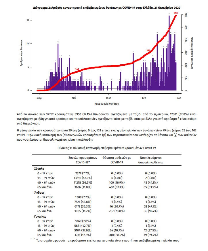 Τέλος, έχουμε 12 ακόμα καταγεγραμμένους θανάτους και 593 θανάτους συνολικά στη χώρα. 225 (37.9%) γυναίκες και οι υπόλοιποι άνδρες. Η διάμεση ηλικία των θανόντων συμπολιτών μας ήταν τα 79 έτη και το 96.1% είχε κάποιο υποκείμενο νόσημα ή/και ηλικία 70 ετών και άνω.