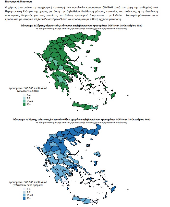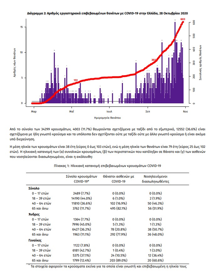 Τέλος, έχουμε 10 ακόμα καταγεγραμμένους θανάτους και 603 θανάτους συνολικά στη χώρα. 228 (37.8%) γυναίκες και οι υπόλοιποι άνδρες. Η διάμεση ηλικία των θανόντων συμπολιτών μας ήταν τα 79 έτη και το 96.2% είχε κάποιο υποκείμενο νόσημα ή/και ηλικία 70 ετών και άνω».