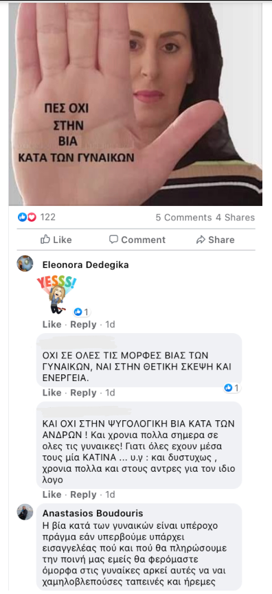 Ο Τάσος Μπουντούρης, που έχει τέσσερις συμμετοχές σε Ολυμπιακούς αγώνες, έγραψε κάτω από ανάρτηση στο Facebook πως «η βία κατά των γυναικών είναι υπέροχο πράγμα. Εάν υπερβούμε υπάρχει εισαγγελέας. Πού και πού θα πληρώσουμε την ποινή μας εμείς που φερόμαστε όμορφα στις γυναίκες αρκεί αυτές να είναι χαμηλοβλεπούσες, ταπεινές και ήρεμες».