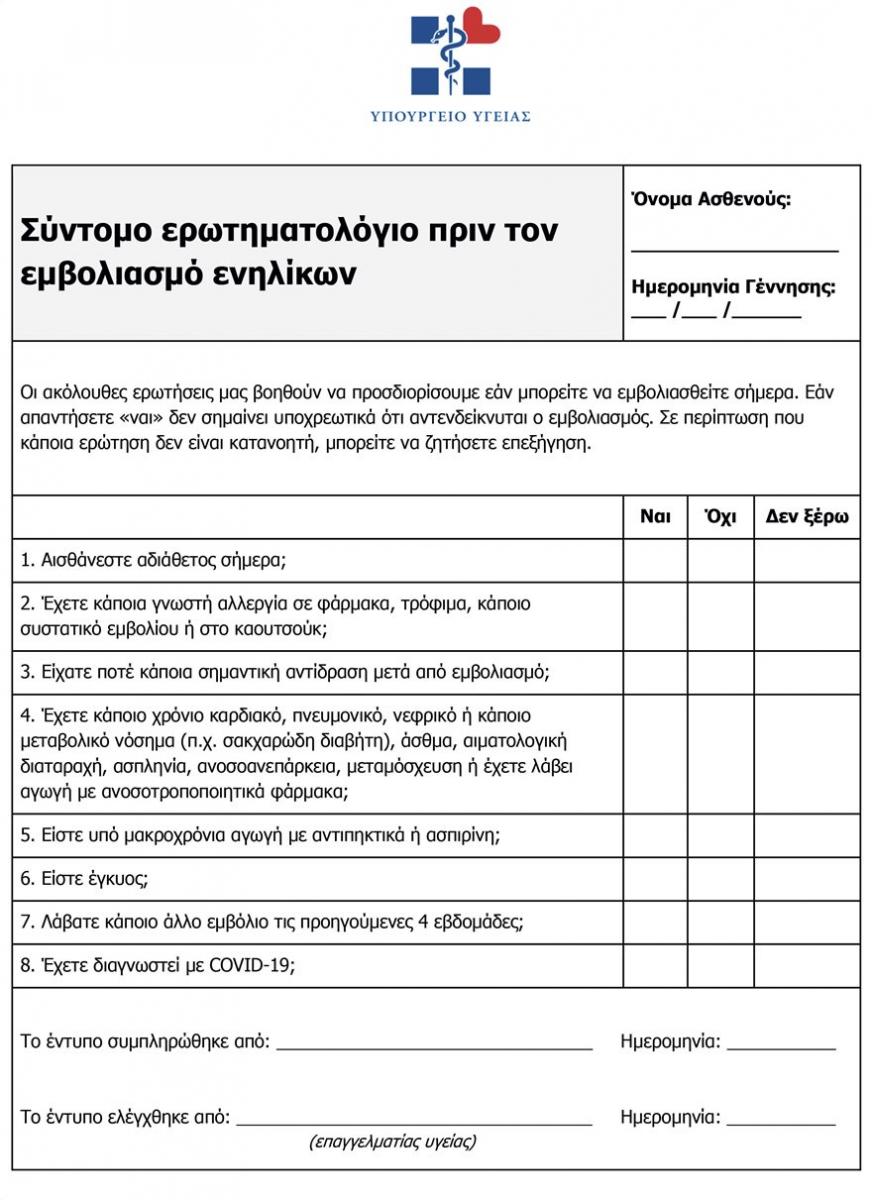 Έντυπο συναίνεσης και ερωτηματολόγιο, που αφορούν τον εμβολιασμό των πολιτών για τον κορονοϊό, απεστάλησαν από το Υπουργείο Υγείας στα 1.018 εμβολιαστικά κέντρα όλης της χώρας.