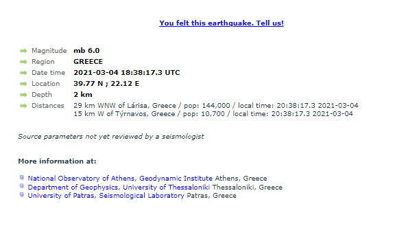 Επιπλέον αναφέρεται πως το επίκεντρο του εντοπίζεται 29 χιλιόμετρα νοτιοδυτικά της Λάρισας και 15 χιλιόμετρα δυτικά του Τυρνάβου.