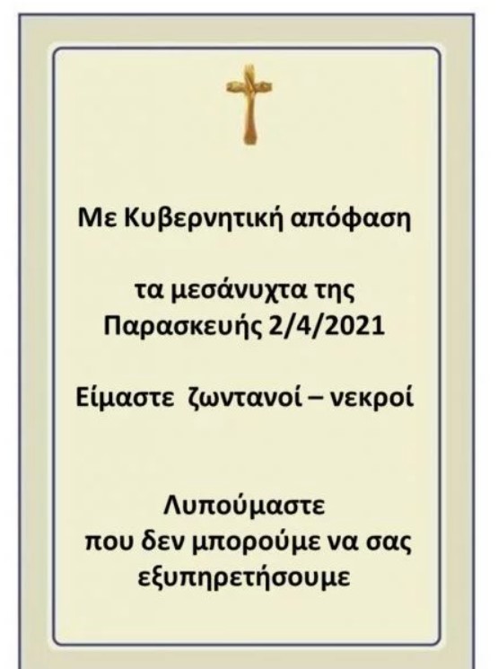 -Όλοι την Δευτέρα το πρωί στις 9:00 στα καταστήματα μας χωρίς προσωπικό, με φώτα και την πόρτα μας ανοιχτή , με όλα τα ατομικά μέτρα προστασίας χωρίς να εξυπηρετούμε καταναλωτές. Αναρτούμε το αφισάκι – κηδειόχαρτο του Συλλόγου και μαύρες σημαίες.