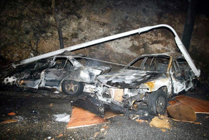 Τρία ΙΧ αυτοκίνητα που ακολουθούν συγκρούονται με τα συντρίμμια και τυλίγονται αμέσως στις φλόγες.