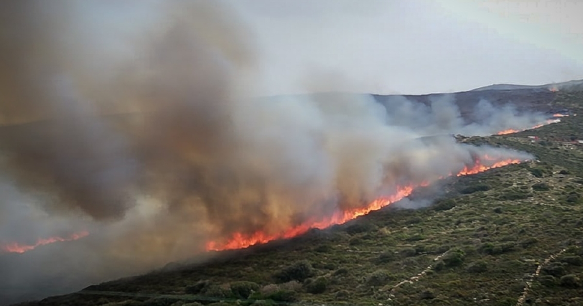Οι ισχυροί άνεμοι δυσχεραίνουν το έργο των επίγειων δυνάμεων που έχουν σπεύσει ενώ έχουν κληθεί και εθελοντικά κλιμάκια.