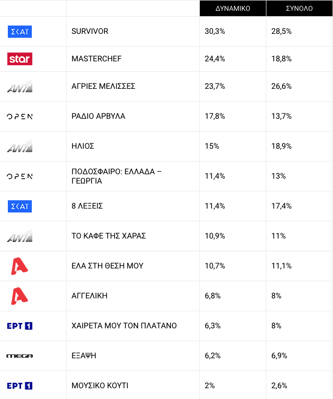 Στην κορυφή παρέμεινε για μια ακόμα φορά το Survivor κερδίζοντας την μάχη της τηλεθέασης.