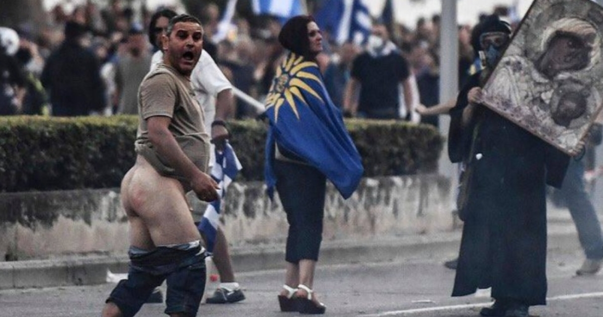 Μία φωτογραφία με έναν ημίγυμνο άνδρα, μία καλόγρια που κρατάει μία εικόνα της Παναγίας φορώντας αντιασφυξιογόνο μάσκα και μία διαδηλώτρια που κρατάει την σημαία με τον Ήλιο της Βεργίνας, τραβηγμένη από τον φωτορεπόρτερ Άρη Μεσσίνη κάνει από χθες το γύρο του κόσμου.