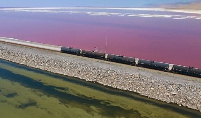 Μπροστά σε μία απίστευτη εικόνα βρίσκονται όσοι αντικρίζουν την Great Salt Lake στο σημείο που χωρίζεται από τις γραμμές του τρένου.
