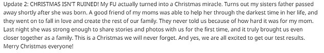«Η μητέρα μου για πρώτη φορά μίλησε γι' αυτό και ειλικρινά τελικά η οικογένειά μας δέθηκε ακόμα πιο πολύ από αυτή την ιστορία. Δεν θα ξεχάσουμε ποτέ αυτά τα Χριστούγεννα. Τελικά, μας βγήκε σε καλό αυτό το δώρο».