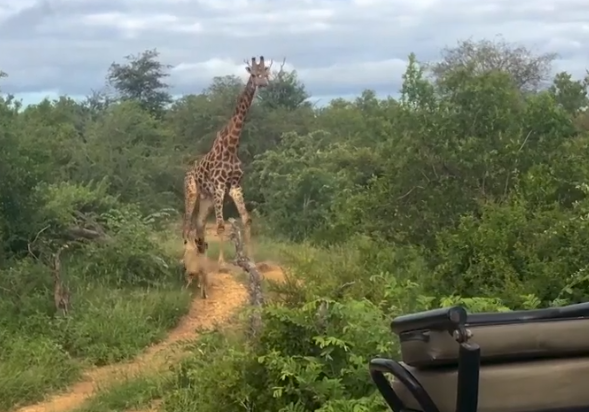 Σύμφωνα με τους τουρίστες, που ακούσιά τους έγιναν αυτόπτες μάρτυρες μίας μονομαχίας την οποία δεν έχουμε την ευκαιρία να παρακολουθήσουμε συχνά, η επίθεση των λιονταριών ξεκίνησε όταν εντόπισαν την καμηλοπάρδαλη σε έκταση του πάρκου, ενώ το όλο σκηνικό φαίνεται να διήρκησε περισσότερες από πέντε ώρες, με το επιβλητικό και πανύψηλο θηλαστικό να καταφέρνει να επιβιώσει χάρη στην επιμονή αλλά και το μέγεθός του.