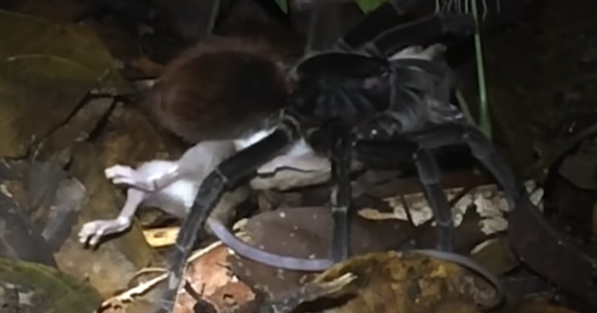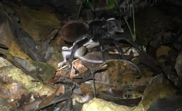 Στα πλάνα εμφανίζεται η τεράστια ταραντούλα -που ως γνωστόν συγκαταλέγεται μεταξύ των σαρκοβόρων- να έχει παγιδεύσει με τα πόδια της το μικρό θηλαστικό, ενώ στη συνέχεια το σέρνει κάτω από ένα δέντρο, αρχίζοντας να το κατασπαράζει.