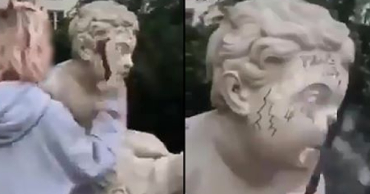 Σε ένα βίντεο που πόσταρε στα social media κρατάει ένα σφυρί στο χέρι της και σπάει τη μύτη ενός αγάλματος 200 ετών σε περιοχή της Πολωνίας.