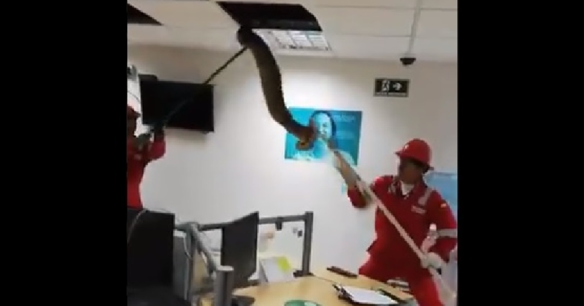Αυτός ακριβώς πρέπει να συνέβη και με μια υπάλληλο εταιρείας στην Κολομβία, που ακούγεται να τσιρίζει, ενώ οι διασώστες τραβούν μέσα από τις γυψοσανίδες το τεράστιο φίδι, το οποίο πέφτει στο πάτωμα!
