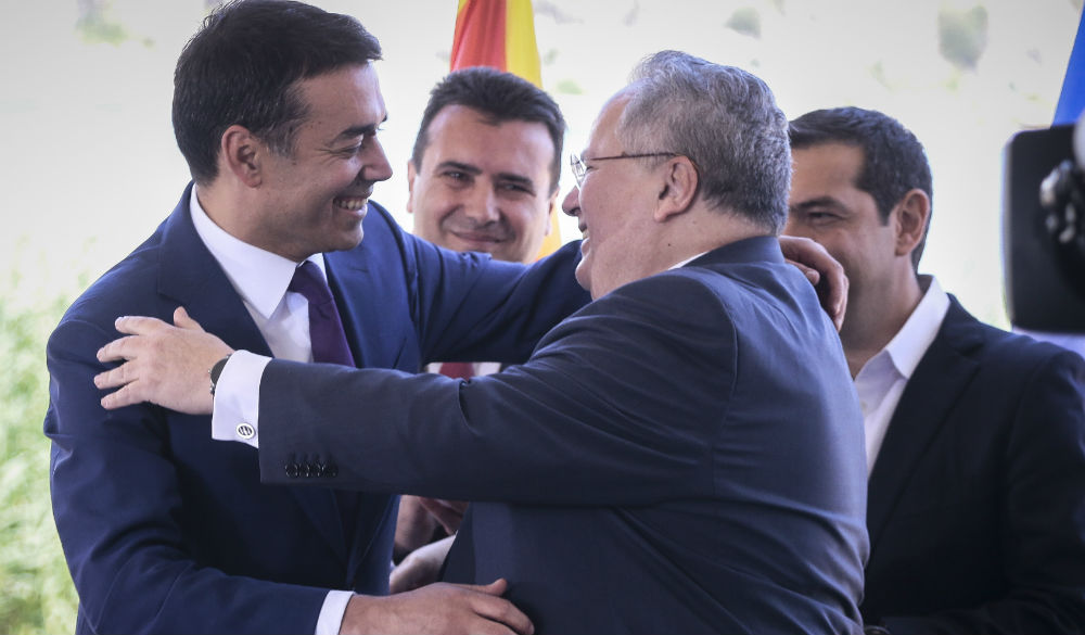 Υπογράφηκε η συμφωνία για το ονοματολογικό της ΠΓΔΜ, από τους υπουργούς Εξωτερικών της Ελλάδας Νίκο Κοτζιά, της ΠΓΔΜ, Νικολά Ντιμιτρόφ και τον ειδικό απεσταλμένο του ΓΓ του ΟΗΕ, Μάθιου Νίμιτς στην ειδική τελετή που πραγματοποιήθηκε στους Ψαράδες της Μ. Πρέσπας.
