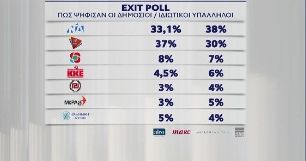Πιο αναλυτικά, ο ΣΥΡΙΖΑ συγκέντρωσε ποσοστό της τάξης του 37% μεταξύ των δημοσιών υπαλλήλων, με τη Νέα Δημοκρατία να φτάνει το 33,4% στην ίδια πληθυσμιακή ομάδα.