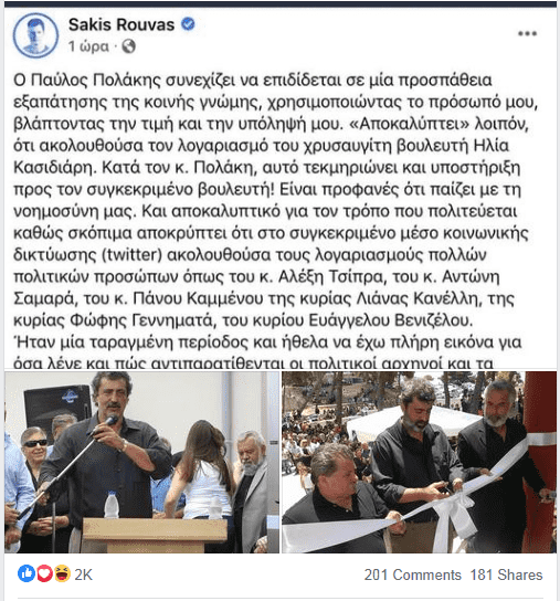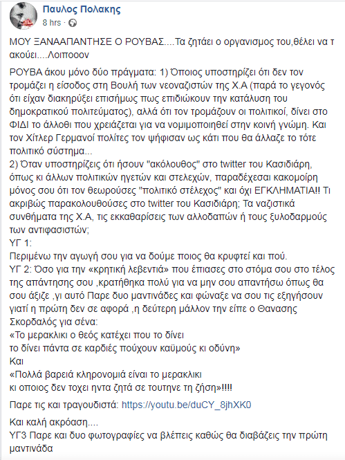 Αναλυτικά η ανάρτησή του: «ΜΟΥ ΞΑΝΑΑΠΑΝΤΗΣΕ Ο ΡΟΥΒΑΣ… Τα ζητάει ο οργανισμός του, θέλει να τ ακούει… Λοιπόοον ΡΟΥΒΑ άκου μόνο δύο πράγματα: 1) Όποιος υποστηρίζει ότι δεν τον τρομάζει η είσοδος στη Βουλή των νεοναζιστών της Χ.Α. (παρά το γεγονός ότι είχαν διακηρύξει επισήμως πως επιδιώκουν την κατάλυση του δημοκρατικού πολιτεύματος), αλλά ότι τον τρομάζουν οι πολιτικοί, δίνει στο ΦΙΔΙ το άλλοθι που χρειάζεται για να νομιμοποιηθεί στην κοινή γνώμη. Και τον Χίτλερ Γερμανοί πολίτες τον ψήφισαν ως κάτι που θα άλλαζε το τότε πολιτικό σύστημα…