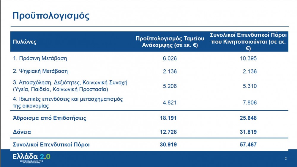Αναλυτικότερα για το σχέδιο θα μιλήσουν στη συνέχεια οι εισηγητές μας που εργάστηκαν για καιρό αθόρυβα και αποτελεσματικά. Θέλω να τους ευχαριστήσω προσωπικά. Τους αξίζουν πραγματικά θερμά συγχαρητήρια για την ποιότητα της δουλειάς τους. Από μέρους μου αρκούμαι να επισημάνω το μέγεθος των πόρων που θα κινητοποιηθούν. Συζητάμε για 57 δισεκατομμύρια ευρώ, εάν προσθέσουμε στα 32 ευρωπαϊκών πόρων, επιχορηγήσεις και δάνεια, και ένα επιπρόσθετο σημαντικό κεφάλαιο 25 δισεκατομμυρίων ευρώ που θα κινητοποιηθούν από τον ιδιωτικό τομέα. Συζητάμε δηλαδή για κάτι πολύ μεγαλύτερο από ένα δεύτερο ΕΣΠΑ.