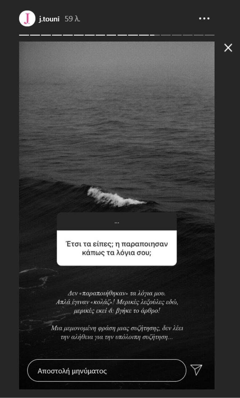 Στα instastories αρχικά ανέφερε, «Θα ήθελα να συζητήσω λίγο μαζί σας για κάτι που με προβλημάτισε αρκετά. Χθες το πρωί, μου έκανε τηλεφωνική κλήση γνωστή μου δημοσιογράφος από Αθήνα, να με ρωτήσει πως είναι τα πράγματα στη Θεσσαλονίκη, αν είναι τόσο τραγικά όσο ακούγονται στις ειδήσεις σχετικά με τα κρούσματα, αν ανησυχώ, τι γίνεται με τις επιχειρήσεις κτλ. Μιλήσαμε μερικά λεπτά και είπαμε αρκετά πράγματα τα οποία μεταφέρθηκαν συνοπτικά σε 9 γραμμές».