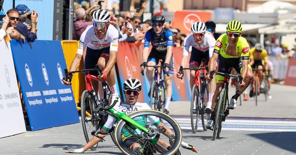 Μία άτυχη στιγμή είχε ο Ισπανός Έντουαρντ Πράδες τη στιγμή τερματισμού στο 1ο ετάπ του ΔΕΗ Ποδηλατικός Γύρος Ελλάδας στο λιμάνι των Χανίων.