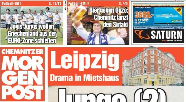 Οσον αφορά την «Chemnitzer morgenpost» είναι λίγο πιο... λάιτ έχοντας στο εξώφυλλο: «Μπύρα εναντίον ούζου», ενώ μέσα αναφέρει: «Δεν υπάρχει λόγος για το ποιος θα προκριθεί. Οι Ελληνες δεν σώζονται σήμερα. Η γερμανική εθνική ομάδα έχει καταστρώσει τα πλάνα της για τα ημιτελικά με τα μάτια της Ανγκελα Μέρκελ να είναι στο Γκντασκ, για την έξοδο της Ελλάδας από την EURO-ζώνη (σ.σ. κάνοντας λογοπαίγνιο)»!