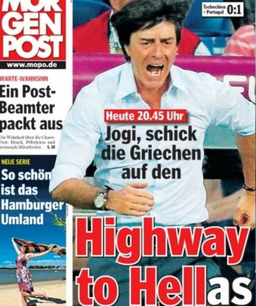 Η εφημερίδα του Αμβούργου έχει στο πρωτοσέλιδο της τον Γιόακιμ Λεβ γράφοντας στα αγγλικά: «Highway to Hell-as», δηλαδή ««Γιόγκι, στείλε τους Έλληνες στο δρόμο για την κόλαση», “παίζοντας" με το hell που σημαίνει αγγλικά και το hellas!