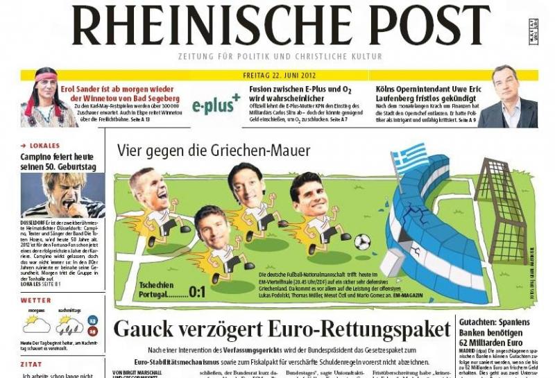 Στις μέσα σελίδες της εφημερίδας υπάρχει μια φωτογραφία του Γιώργου Καραγκούνη να πανηγυρίζει με Ελληνες στην εξέδρα και ο τίτλος του εντύπου γράφει: «Το ελληνικό ποδόσφαιρο είναι η ελπίδα» και στη συνέχεια αναφέρει: «Η Ελλάδα υποφέρει από την οικονομική κρίση και οι Ελληνες υποφέρουν στην Γερμανία από τους ανθρώπους που τους συμπεριφέρονται άσχημα. Οι εμφανίσεις στο ευρωπαϊκό πρωτάθλημα είναι οι μοναδικές που τους δίνουν χαμόγελο», ενώ υπάρχει και συνέντευξη ενός Έλληνα (Νίκος Νικολαϊδης) που έχει καφετέρια στο Ντίσελντορφ και μιλάει για την Ελλάδα, τον ΠΑΟΚ και την Θύρα 4.