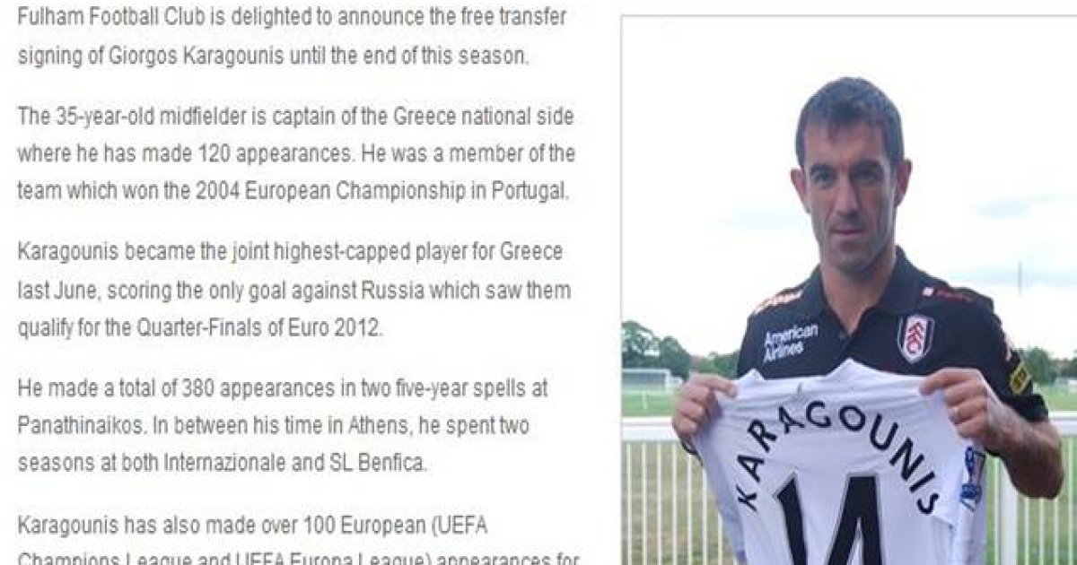 «Η Φούλαμ ανακοινώνει με ενθουσιασμό την μεταγραφή του Γιώργου Καραγκούνη με ελεύθερη μεταγραφή μέχρι το τέλος της χρονιάς», αναφέρει χαρακτηριστικά στο ξεκίνημά της η ανακοίνωση τους οι Λονδρέζοι, οι οποίοι στη συνέχεια φιλοξενούν μακροσκελή αναφορά στον αρχηγό της Εθνικής.