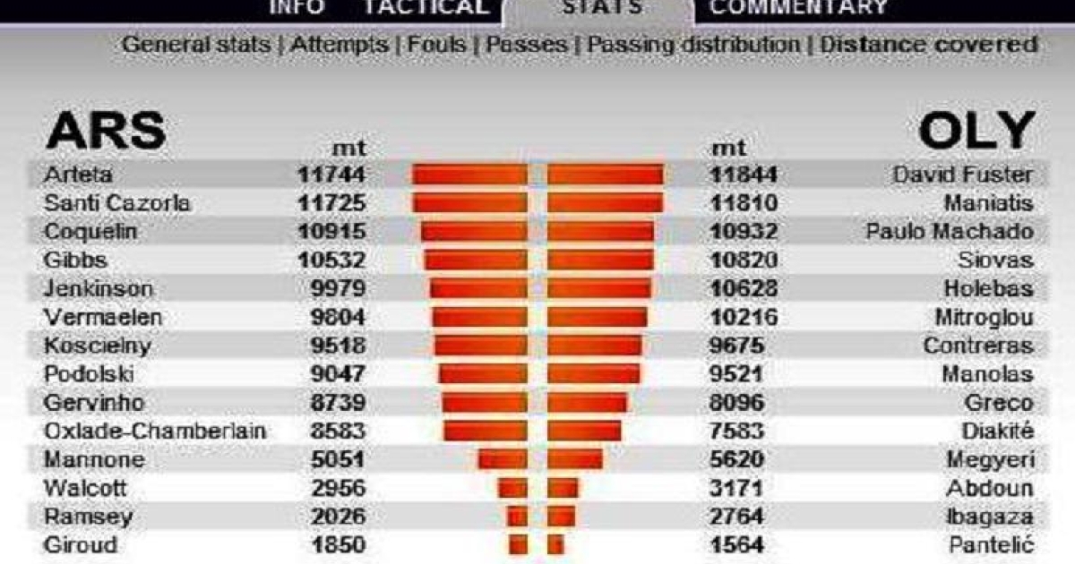 Αξίζει να σημειωθεί, ότι ο Ολυμπιακός στο α' μέρος είχε 55,9 χλμ. και η ομάδα του Βενγκέρ 53,7, ενώ στην επανάληψη οι Άγγλοι πάτησαν γκάζι, ανεβάσανε ταχύτητα και βγάλανε 58,7 έναντι 58,3 των φιλοξενούμενων, που όντως έδειξαν ότι κουράστηκαν από ένα σημείο και μετά.